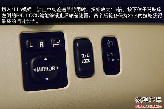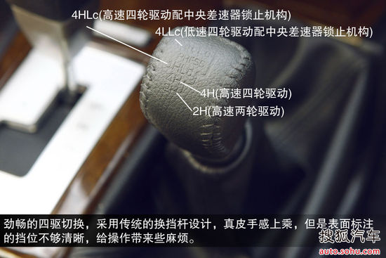 勁暢仍然使用傳統(tǒng)的四驅(qū)切換操作桿設(shè)計,操作桿與換擋桿采用了相同的真皮包裹,手感上乘。位于皮革表面的四驅(qū)檔位標(biāo)示有些模糊,給初次接觸這套系統(tǒng)的用戶帶來了一些麻煩。其四驅(qū)采用三菱的SS4超選四驅(qū)系統(tǒng),提供2H(高速兩輪驅(qū)動)、4H(高速四輪驅(qū)動)、4HLc(高速四輪驅(qū)動配中央差速器鎖止機構(gòu))、4LLc(低速四輪驅(qū)動配中央差速器鎖止機構(gòu))四種模式。