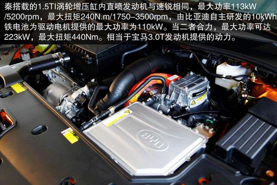 動力方面:秦搭載的1.5TI渦輪增壓缸內(nèi)直噴發(fā)動機與速銳相同,最大功率113kW/5200rpm,最大扭矩240N.m/1750-3500rpm,由比亞迪自主研發(fā)的10kWh鐵電池為驅(qū)動電機提供的最大功率為110kW。當二者合力,最大功率可達223kW,最大扭矩440Nm。傳動方面,該車匹配的是一臺DCT雙離合變速箱,官方表示該車0-100km/h的加速時間為5.9秒。