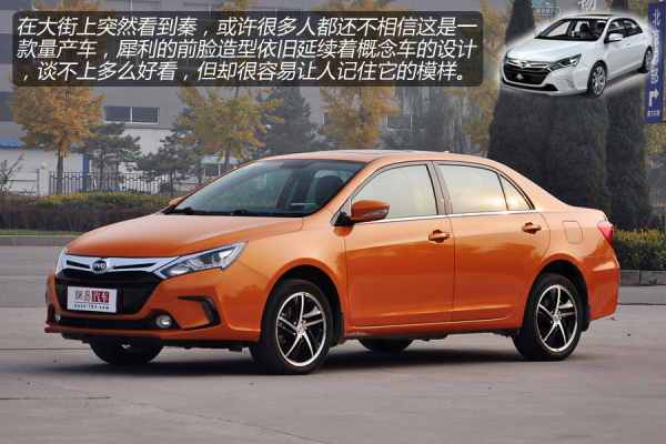 秦量產(chǎn)版大致延續(xù)了概念車的整體設(shè)計,與速銳的中庸設(shè)計相比,顯得更加的前衛(wèi)、霸氣。為適應(yīng)量產(chǎn)化需求,量產(chǎn)版對燈光布局進(jìn)行了調(diào)整,原本位于保險杠兩側(cè)的LED行車燈被整合至大燈內(nèi),原位置被轉(zhuǎn)向燈所取代。另外,在保險杠內(nèi)側(cè)還加入了橢圓造型的霧燈。