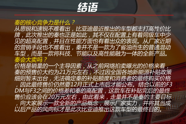 據(jù)官方消息,比亞迪秦的預(yù)售價為20萬起,該車是在2012年北京車展首發(fā)亮相的,其最大亮點在于搭載雙擎雙模技術(shù),官方宣傳該車的百公里加速僅需5.9秒,百公里油耗僅需1.6升。網(wǎng)易汽車根據(jù)最新出臺的新能源汽車補貼政策測算,秦的補貼范圍預(yù)計在3.5萬元。