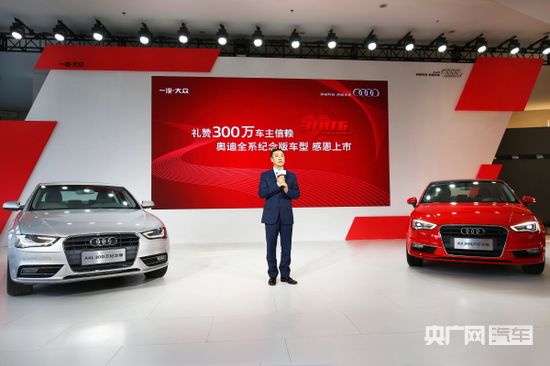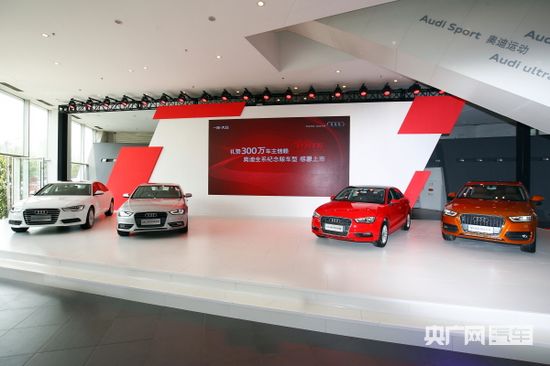 2015年5月21日,一汽-大眾奧迪正式宣布:奧迪品牌在華累計銷量突破300萬輛。為答謝用戶而打造的四款“300萬紀念版”車型——奧迪A6L 300萬紀念版、奧迪A4L 300萬紀念版、奧迪A3 300萬紀念版和奧迪Q3 300萬紀念版,即日起正式上市。
