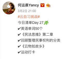 假期延長后,北京航空航天大學(xué)法學(xué)院碩士生何運晨便在微博發(fā)起“云自習(xí)挑戰(zhàn)”,邀請網(wǎng)友一起微博打卡,分享每日的學(xué)習(xí)內(nèi)容、心得體會,同時邀請自己的朋友做“云監(jiān)工”。這段日子里,很多網(wǎng)友都跟隨著何運晨和“云監(jiān)工”們的腳步每日堅持打卡。