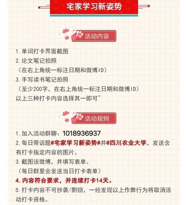 如四川農(nóng)業(yè)大學(xué)發(fā)起的“宅家學(xué)習(xí)新姿勢”,學(xué)生如果按要求連續(xù)打卡14天,還可以獲得1分第二課堂賦分。也有些“學(xué)霸”則是按照自己的節(jié)奏,合理安排居家學(xué)習(xí)。