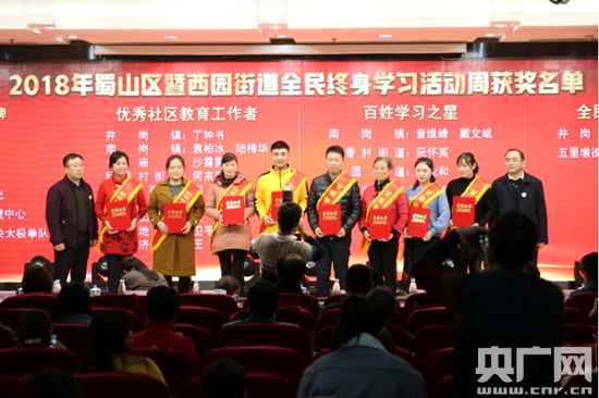 央廣網(wǎng)合肥12月29日消息 2018年12月21日下午,蜀山區(qū)暨西園街道全民終身學習活動周開幕式在合肥市科技館舉行。開幕式上對本年度的區(qū)級“百姓學習之星”“全民終身學習體驗點”“優(yōu)秀社區(qū)教育工作者”“優(yōu)秀社區(qū)教育活動品牌”進行了表彰。西園街道“老少同樂共度好時光”等6個品牌為優(yōu)秀社區(qū)教育活動品牌;琥珀街道陶偉等12名同志為優(yōu)秀社區(qū)教育工作者;五里墩街道夏玉進等6名同志為“百姓學習之星”;井崗鎮(zhèn)“十里書香城市閱讀空間”、五里墩街道家家景園社區(qū)“微課堂”被評為“全民終身學習體驗點”。