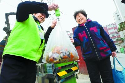 勁松五區(qū)分布著26棟居民樓,1200戶居民,社區(qū)齊整清凈。上午9點(diǎn)多,63歲的國(guó)紅秀趕到小屋門口,熟練地把分好類的垃圾遞給工作人員。稱重、刷卡、積分,短短1分鐘,一袋果皮菜葉和幾個(gè)紙盒就為她掙了4分。“垃圾分類是習(xí)慣成自然,一點(diǎn)兒都不難!眹(guó)阿姨說,社區(qū)給每戶家庭都發(fā)放了垃圾分類指導(dǎo)手冊(cè),通俗易懂,一學(xué)就會(huì),“比如說這廚余垃圾吧,簡(jiǎn)單說就是會(huì)‘爛’的垃圾,像果皮、骨頭、菜葉、蛋殼之類!爆F(xiàn)在,她的積分卡里已經(jīng)有80分了,能換洗手液、衛(wèi)生紙等生活用品,也可以享受家政保潔、理發(fā)等社區(qū)服務(wù)。