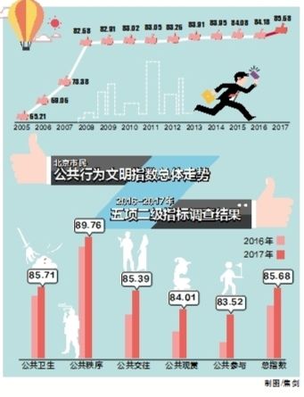 2017年北京市民公共行為文明指數(shù)發(fā)布:首次突破85,達(dá)85.68,比2016年提升了1.5個(gè)分值;與2005年相比,這個(gè)數(shù)字上升了20.47。調(diào)查顯示,公共交往、公共觀賞、公共參與指數(shù)大幅上升,而“隨地吐痰”“闖紅燈”“不進(jìn)行垃圾分類”依然是受訪者眼中最不文明的行為。