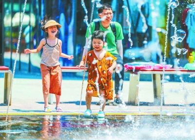 北京連日晴熱高溫,在五棵松華熙,孩子們在一處噴泉邊戲水納涼。本報(bào)記者 武亦彬攝