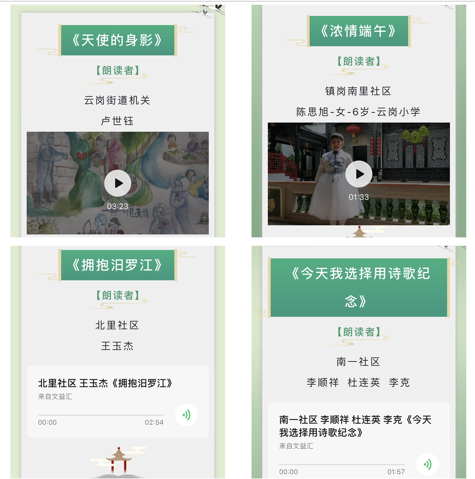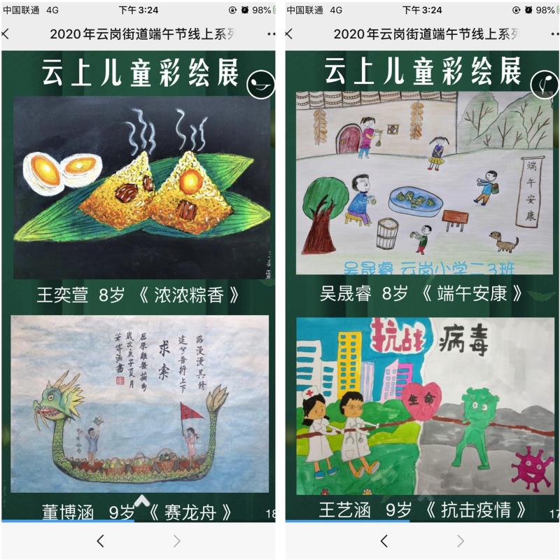 “往年端午節(jié),都是在線下以各種形式舉辦活動,弘揚家國情懷、感受中華優(yōu)秀傳統(tǒng)文化、寄托美好愿望。疫情期間,為防止人流密集、保證居民身體健康,目前還不能開展聚集性活動,通過‘互聯(lián)網(wǎng)+文化’的形式,讓轄區(qū)居民朋友們匯聚‘云端’,在感受傳統(tǒng)文化魅力的同時,學(xué)習(xí)防疫知識,用聲音、用畫筆為抗疫加油鼓勁!”云崗街道辦事處社區(qū)建設(shè)辦公室副主任李明輝說。