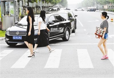 7月5日,貼著“禮讓斑馬線”的滴滴快車從后廠村路附近的馬路經過。在即將到達斑馬線時,幾位司機都穩(wěn)穩(wěn)踩住了剎車,路過的行人側頭露出笑容。