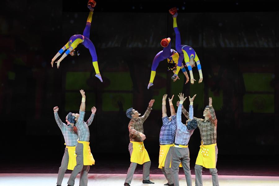 12月15日,演員在《我和我的青春—青春ing》雜技主題晚會(huì)中表演雜技《我家有女初長成——頂碗》。