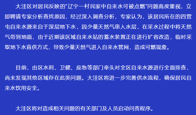 此外,大洼區(qū)正在對全區(qū)進行排查,尚未發(fā)現(xiàn)其他水井有天然氣泄漏的問題。