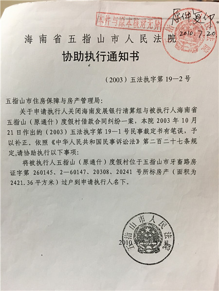 海南省五指山市人民法院協(xié)助執(zhí)行通知書