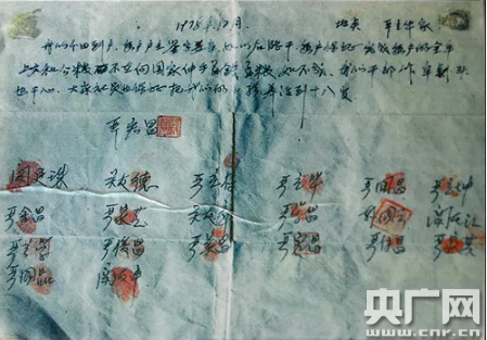 1978年,嚴金昌所在的小崗生產隊人均收入只有22塊錢,每天的口糧只有2兩8錢。窮則思變,就是在那一年的冬天,臨近春節(jié)的一個寒夜,小崗生產隊的18戶戶主在村西頭的嚴立華茅草屋里就著微弱的煤油燈,在包干到戶的契約書上摁下了紅手印。嚴金昌說:“有人說這么干肯定犯法,有的說犯法我們豁出去了,我們收一年莊稼,收半季莊稼,夠吃飽肚子,拉出去殺頭、坐牢也心甘情愿,無怨無悔,總比餓死強,特別是出去要飯,丟人!