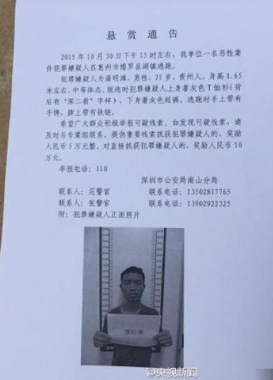 根據(jù)深圳市公安局南山分局的通報,30號下午,犯罪嫌疑人被深圳警方帶到博羅縣指認(rèn)丟棄作案工具現(xiàn)場的時候,趁機跳車逃入山里面。警方對這名犯罪嫌疑人的描述是,男性,21歲,貴州人,身高1.65米,中等體態(tài),逃脫時身穿灰色T恤和灰色長褲,背后印有“深二看”三個字。