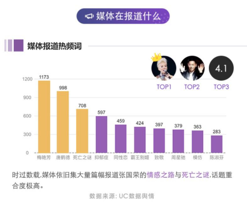 從大數(shù)據(jù)可以看到,張國榮離世14年,最受媒體關注的還是他身前的感情,以及死亡原因。排名前三的分別是梅艷芳、唐鶴德和死亡之謎。