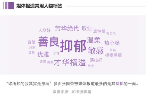 此外,UC大數(shù)據(jù)顯示,芳華絕代、才華橫溢、真性情、善良等等形容人美好的詞匯集于張國榮一身。其人格魅力的折射,粉絲對他經(jīng)年不忘。據(jù)了解,張國榮的粉絲已遍布海內(nèi)外,今年就有日本粉絲折疊912只藍色千紙鶴為其祈福。