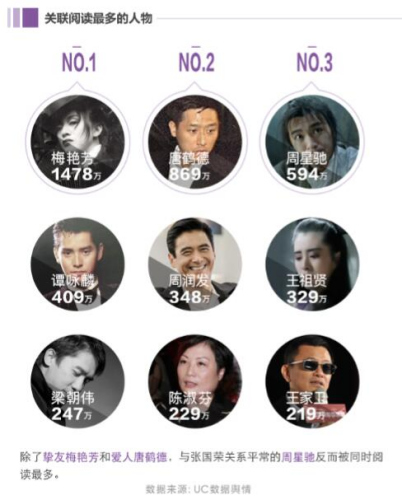 每當提到張國榮,大家總愛回憶他昔日的愛人、好友等,UC大數(shù)據(jù)顯示梅艷芳是粉絲緬懷張國榮時的閱讀熱頻詞和關聯(lián)閱讀最多的人物。同為香港傳奇巨星,互為摯友,張國榮和梅艷芳相隔8個月先后隕落。兩人命運何其相似,皆留給世人無盡芳華。同時,粉絲還較為關注與張國榮合作過的周星馳、王祖賢及初戀情人毛舜筠等人。