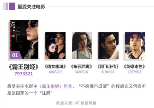 在最受關注的作品中,粉絲較為關注張國榮主演的《霸王別姬》《倩女幽魂》等電影和演唱的《風繼續(xù)吹》《當年情》等曲目。這些作品不僅在香港電影和流行歌曲的黃金時代中留有濃墨重彩的一筆,在中國文娛發(fā)展史上,皆有一席之地,堪稱經(jīng)典。據(jù)了解,張國榮在演《霸王別姬》時,被評價“把靈魂投入到了角色里”。不難理解,粉絲對其作品的高關注度,有其演繹直擊人心的原因。