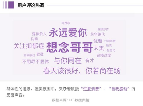 張國榮逝世14年,熱度未減,每年都有大規(guī)模的追憶活動和報道。值得探究的是,在UC用戶評論熱詞中,除了主流的表達“想念哥哥、永遠愛你、與你同在”等追思之詞,但同時也有不少網(wǎng)友對每年一次“緬懷張國榮”的現(xiàn)象發(fā)出了“追捧過度、媒體殺人、過度消費”等質(zhì)疑的聲音。