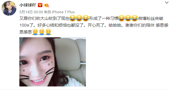 在微博粉絲突破百萬(wàn)的當(dāng)天,球球深夜發(fā)微博感謝粉絲一路的陪伴,表示與粉絲侃大山已經(jīng)成為了一種習(xí)慣,言語(yǔ)中透露著粉絲破百萬(wàn)的喜悅和感恩。