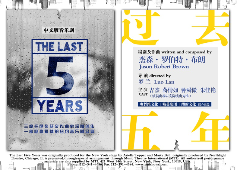 音樂(lè)劇《過(guò)去五年》由三度獲得托尼獎(jiǎng)的杰森·羅伯特·布朗于2001年創(chuàng)作,講述了一對(duì)戀人在五年間的情感波折。音樂(lè)與故事的完美結(jié)合,正敘和倒敘穿插的雙線敘事,使這出劇獲得了紐約劇評(píng)人和觀眾的一片好評(píng),并一度成為全球被排演次數(shù)最多的音樂(lè)劇之一。2015年,該劇被搬上電影銀幕,由安娜·肯德里克和杰瑞米·喬丹主演。