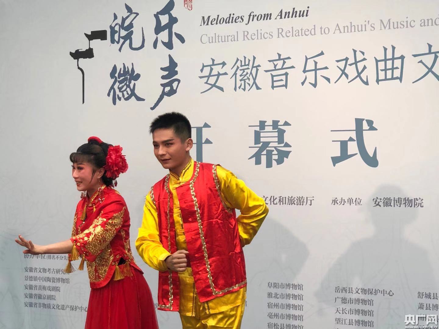 安徽得占地利,各種戲曲藝術(shù)在地域文化的滋養(yǎng)下融合吐納,孕育發(fā)展出眾多地方聲腔。從商周的鐘鼓之樂(lè),至漢唐的樂(lè)舞百戲、說(shuō)唱,再到宋元明清的戲曲藝術(shù),安徽多姿多彩的音樂(lè)戲曲文化跟隨時(shí)代的步伐一路向前,時(shí)至今日仍活躍于舞臺(tái)之上,豐富著人民的精神文化生活。開幕式當(dāng)天,受邀參加開幕式的百余位來(lái)賓共同欣賞了由蕪湖縣黃梅戲劇團(tuán)帶來(lái)的黃梅戲表演,淳樸流暢的唱腔、質(zhì)樸細(xì)膩的表演,展現(xiàn)出黃梅戲的獨(dú)特魅力。隨后,在安徽博物院保管部主任徐大珍的導(dǎo)覽下,一幅安徽省音樂(lè)、戲曲藝術(shù)畫卷在所有觀者面前徐徐展開。