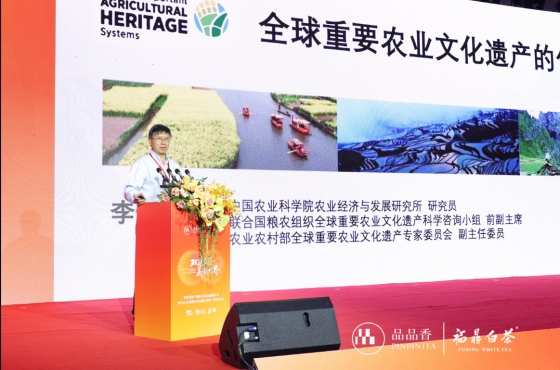 現(xiàn)場還延請兩位權威專家作專題分享。中國農(nóng)科院農(nóng)業(yè)經(jīng)濟與發(fā)展研究所研究員、聯(lián)合國糧農(nóng)組織全球重要農(nóng)業(yè)文化遺產(chǎn)科學咨詢小組前副主席李先德以《全球重要農(nóng)業(yè)文化遺產(chǎn)的傳承和發(fā)展》為題,結合全球農(nóng)遺標準與福鼎實踐,指出“福建福鼎白茶文化系統(tǒng)”的核心特征——提供食物營養(yǎng)與生計安全保障、擁有豐富的農(nóng)業(yè)生物多樣性、當?shù)貍鹘y(tǒng)知識與技術體系、極具地方特色的茶文化、多樣迷人的茶園景觀。同時提出保護端需守護茶樹種質、傳統(tǒng)技藝與習俗;發(fā)展端要打造高端特色產(chǎn)品、探索茶文旅融合,并構建“政府-企業(yè)-合作社-茶農(nóng)”多方利益共享機制,保障福鼎白茶可持續(xù)發(fā)展。