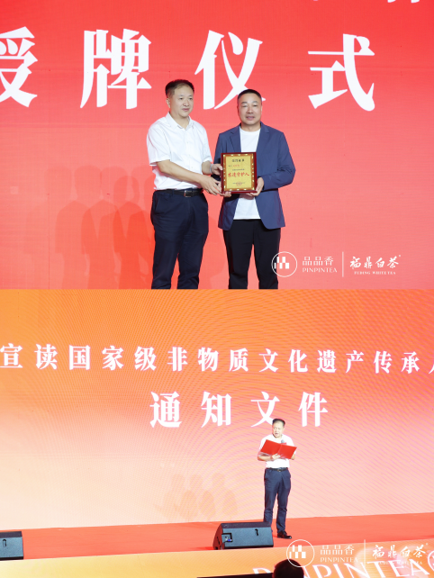 活動現(xiàn)場還舉行了授牌儀式。福鼎市人大常委會主任、福鼎市茶產(chǎn)業(yè)發(fā)展領導小組常務副組長 蔡梅生現(xiàn)場宣讀、福建品品香茶業(yè)有限公司董事長林振傳入選國家級“非遺傳人”的通知文件,并授予林振傳董事長“農(nóng)遺守護人”榮譽稱號。