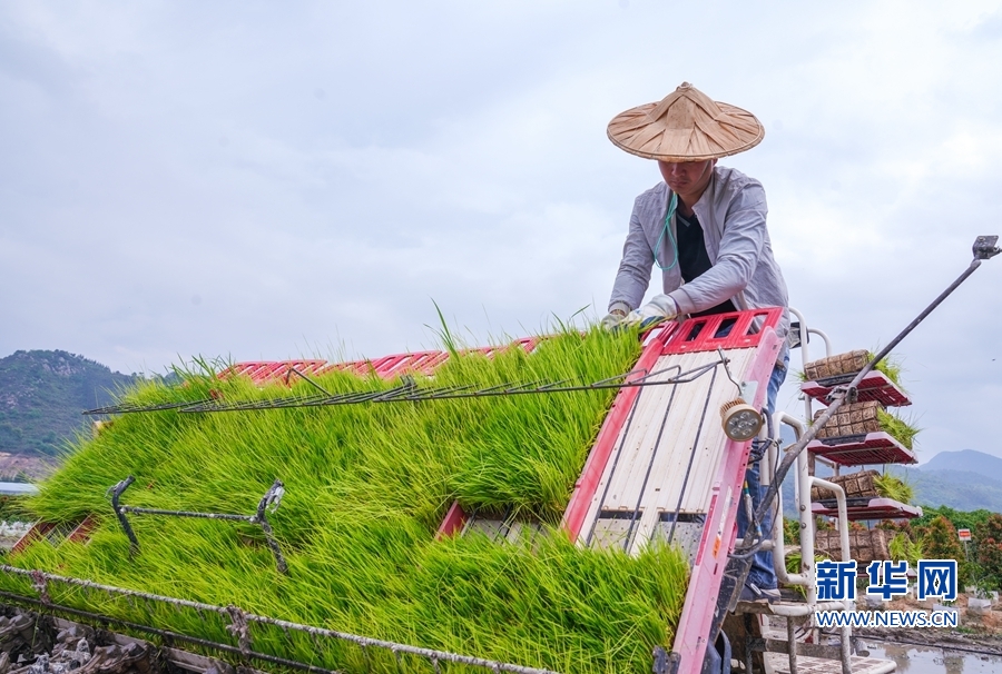 農(nóng)戶(hù)將秧苗放在插秧機(jī)機(jī)架上。新華網(wǎng) 肖和勇 攝