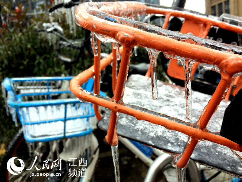 人民網(wǎng)南昌1月28日電(時(shí)雨)連日來,南昌遭遇低溫凍雨天氣,夜間的溫度跌至0℃以下。28日,本網(wǎng)在南昌街頭看到,低溫加凍雨使戶外的物體裹上了厚厚的“冰衣裳”,散落在街頭的各類共享單車不少已經(jīng)成為“冰雕”,車把手、車筐甚至車輪胎都結(jié)了冰,這些被“冰封”的共享單車停靠在路邊無人問津。 -