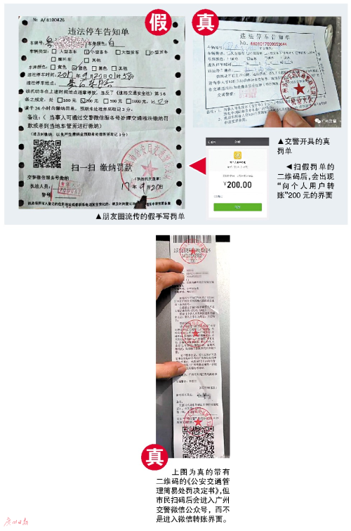 真假《違法停車告知單》主要存在三方面區(qū)別:1.版式明顯不同;2.文字表述不同;3.偽造的告知單有二維碼,而廣州交警的《違法停車告知單》沒(méi)有印制二維碼。