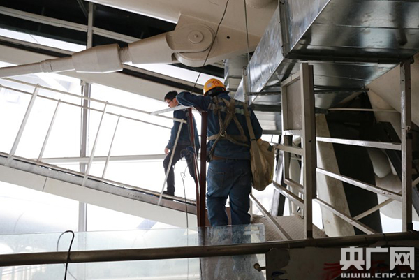 “廣州南站南北雨棚距站臺面高達26米,大型登高設備無法進入,車間現(xiàn)有12米登高車,但高度遠遠不足,雨棚吊頂末設置修檢通道,換燈危險系數(shù)極高!惫偶褬苏f。