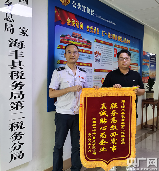 央廣網(wǎng)汕尾10月26日消息(記者官文清 通訊員陳思宇 童振躍)“海豐稅務(wù)人員主動上門指導(dǎo)留抵退稅事宜,僅用兩天時(shí)間退稅款就到我們賬戶了,真金白銀落袋,為我們解決了復(fù)工后資金周轉(zhuǎn)的實(shí)際困難。”近日,華耀城(海豐)置業(yè)有限公司將一面印有“服務(wù)高效辦實(shí)事,真誠貼心為企業(yè)”的錦旗送至海豐縣稅務(wù)局第二稅務(wù)分局,對稅務(wù)人員真誠貼心、全面提速為企業(yè)排憂解難的服務(wù)表示充分肯定及衷心感謝。