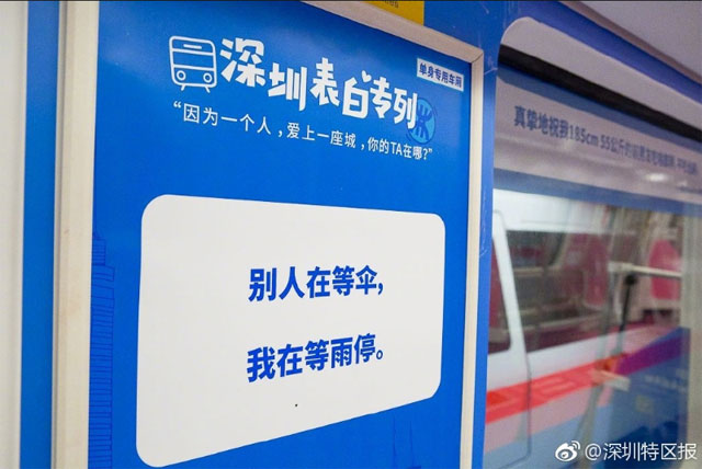 據(jù)深圳特區(qū)報(bào)報(bào)道:“同學(xué),有沒有覺得對面那位很像你下任女朋友”,近日,深圳開了地鐵表白專列,將在1號線運(yùn)行1個(gè)月,5月8號發(fā)車,每天巡回行駛,內(nèi)含單身專用車廂!上千條表白中有對喜歡的人的表白,有對父母的表白,對同學(xué)的表白。網(wǎng)友:單身車廂扎心了!