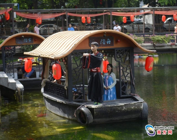 入場儀式過后,上演“彈絲樂禮”古箏彈唱表演,古代君王們功業(yè)成就才做樂,天下平定了才成禮。隨后接著的“嶺南舞韻”更是增添了宴會上的歡愉氣氛。在紅云宴期間湖面上還有緩緩行駛的一條船,船上一人舉酒杯,一人捧酒缽。船隨岸而行,每到坐客處即停?腿吮闳”嬀,將杯還給舉酒杯的人,捧酒缽人斟酒滿杯,船再前行。