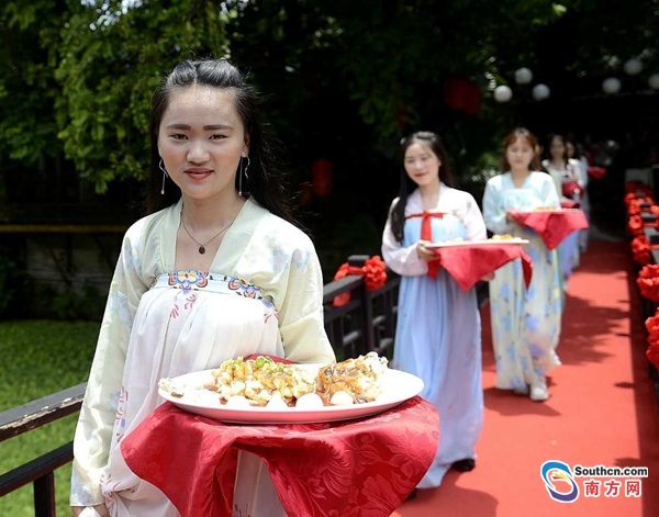 當(dāng)然紅云宴為何重現(xiàn)傳統(tǒng)的場景也并不只有菜肴。上午9時30分,“六月六,紅云宴”開始,一群身穿南漢服裝的大臣和侍女等候在宴會廳外迎接貴賓。賓客入場后,施禮官介紹本次紅云宴活動,為活動正式開場。