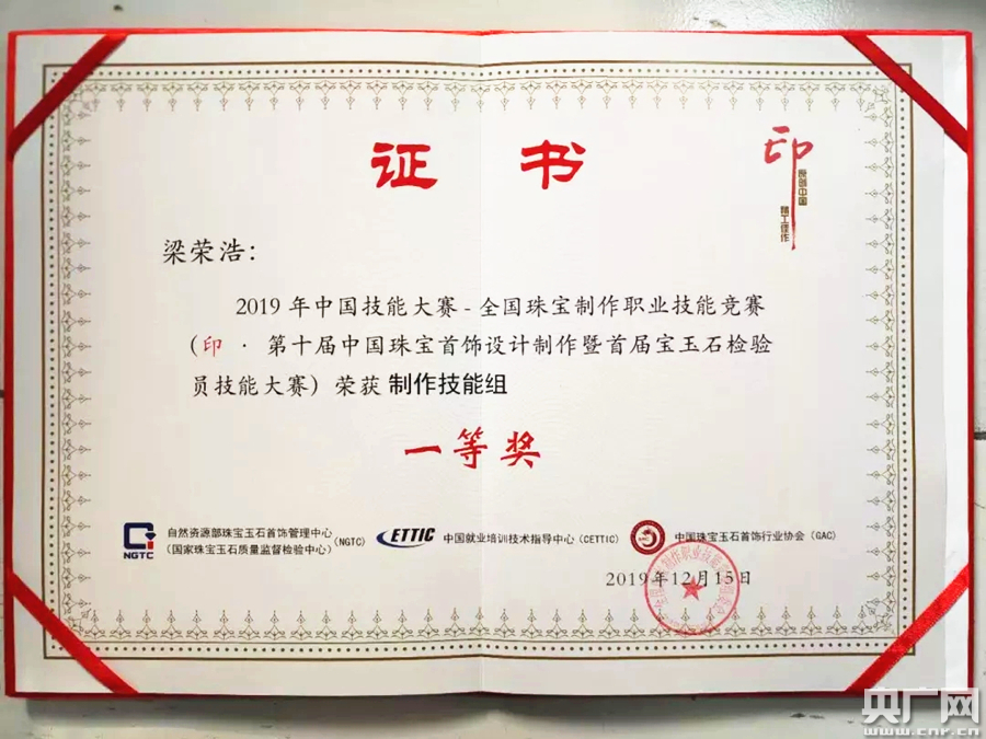 梁榮浩在2019全國(guó)珠寶制作職業(yè)技能競(jìng)賽中獲職工組一等獎(jiǎng)。(央廣網(wǎng)發(fā) 受訪者供圖)