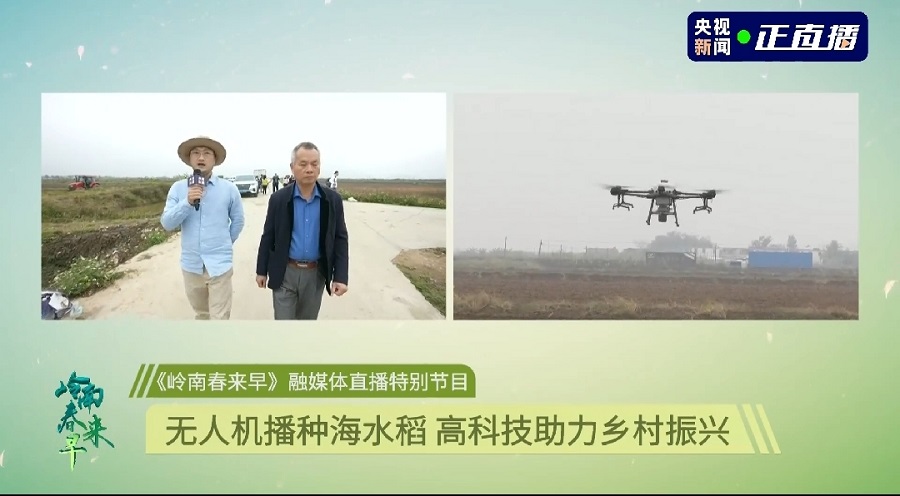 直播中,記者走進江門市臺山市海宴鎮(zhèn),這里有著一片海水稻試驗田,農(nóng)用無人機正在播撒海水稻種子,呈現(xiàn)出一派春耕景象。