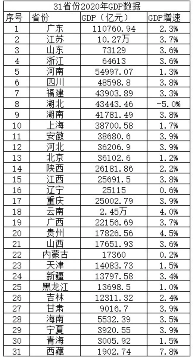2020年,廣東省地區(qū)生產(chǎn)總值超過11萬億元,連續(xù)32年領跑全國,增速2.3%。江蘇省經(jīng)濟總量首次跨過10萬億門檻,達到10.27萬億元,但增速高于廣東,達到3.7%。山東省以7.3萬億的總量繼續(xù)名列第三,增速3.6%。