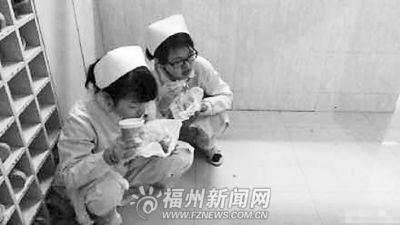 照片中,兩名年輕女護士正蹲在一個鞋柜旁,戴著一次性手套,埋頭吃快餐。該網友在微博上說,照片攝于福州一家醫(yī)院,這是這些護士的日常夜班狀態(tài),如果遇上大規(guī)模的意外事故,她們可能連飯也吃不上。