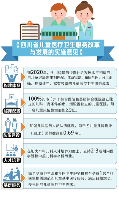 到2020年,全川將構(gòu)建起與經(jīng)濟(jì)社會(huì)發(fā)展水平相適應(yīng)、與兒童健康需求相匹配、體系完整、布局合理的兒童醫(yī)療衛(wèi)生服務(wù)體系。所有市(州)綜合醫(yī)院和縣級(jí)綜合醫(yī)院設(shè)立獨(dú)立的兒科,有條件的市、州設(shè)置獨(dú)立的兒童醫(yī)院。每千名兒童床位數(shù)增加到2.5張。