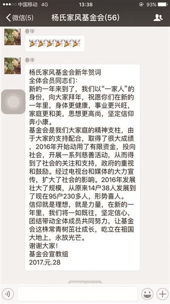 楊振海告訴記者:“剛開始的時(shí)候,這個(gè)群里的人比較少,就我的五個(gè)兒子,然后加上孫子輩的家庭,后來家庭成員們都知道了,就發(fā)展到三房兄弟,微信群就壯大了,基金會(huì)也初具規(guī)模,現(xiàn)在還有專人負(fù)責(zé),長孫楊勇是基金會(huì)會(huì)長,學(xué)財(cái)務(wù)的孫女楊娟負(fù)責(zé)管財(cái)務(wù),當(dāng)小學(xué)教師的孫女負(fù)責(zé)群里的日常慈善宣傳!
