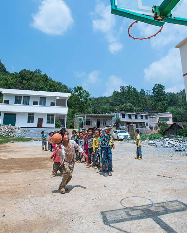 孩子們在建好的新校舍前開心地打著籃球,校舍旁低矮的平房曾是學校的廚房。