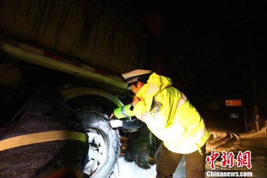 交警檢查貨車雪地行車安全 榮滔 攝