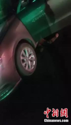 監(jiān)控畫面顯示:21日凌晨,發(fā)生一起小轎車與電動自行車碰撞事故,電動自行車駕駛?cè)吮粔涸谛∞I車底部,無法動彈。