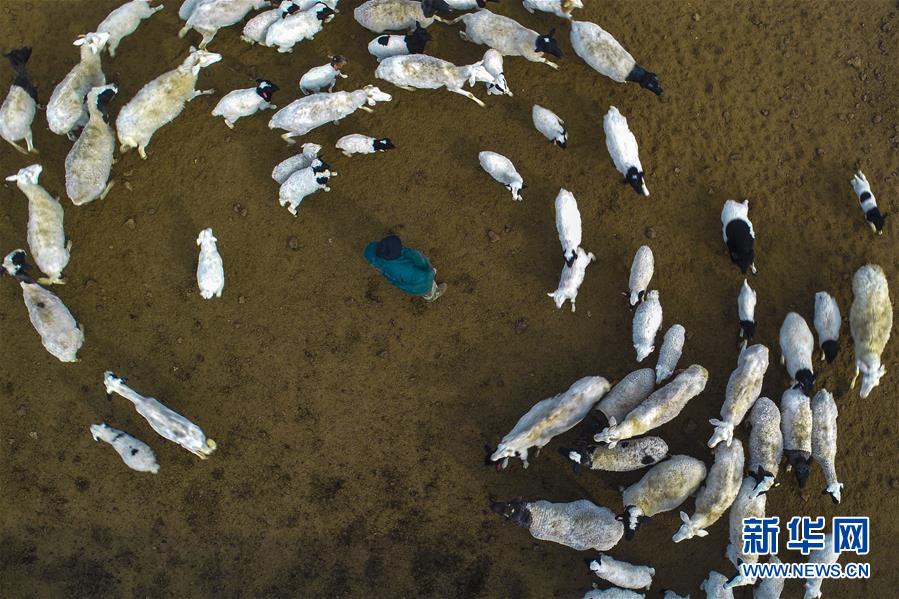 在河北省棗強(qiáng)縣欣苑養(yǎng)殖有限公司,工作人員在趕羊(2月20日無人機(jī)拍攝)。