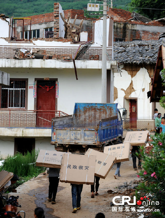 2014年8月4日,云南省魯?shù)榭h,震中龍頭山鎮(zhèn)村民領(lǐng)取救援物資。圖片來源:攝記/CFP