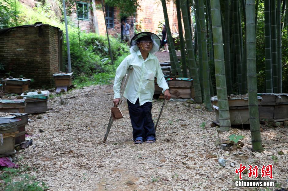8月6日,湖南省資興市興寧鎮(zhèn)朝光村何家組村民樊細萬正忙著取蜂蜜。64歲的樊細萬因小兒麻痹癥落下二級殘疾,行動極為不便。他卻身殘志堅,不等不靠,10多歲就拄著雙拐,利用東江湖畔良好的生態(tài)環(huán)境與豐富的山林資源,孤身一人來到深山養(yǎng)蜂,終身與蜂為伴,一干就是50年。目前,樊細萬共養(yǎng)了70多箱蜂,年產(chǎn)土蜂蜜600多斤。 靠雙拐行走。朱孝榮 攝