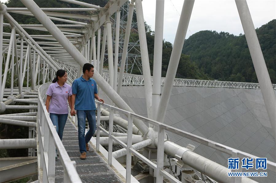 孫純(左)與石向瑋在FAST總控室內(nèi)觀看FAST全景圖(8月9日攝) 新華社記者張傳奇 攝 在世界最大單口徑射電望遠(yuǎn)鏡——500米口徑球面射電望遠(yuǎn)鏡(FAST)項(xiàng)目組,光信息科學(xué)專業(yè)畢業(yè)的孫純和熱能與動(dòng)力工程專業(yè)畢業(yè)的石向瑋因FAST結(jié)緣,在今年7月完婚。他們的結(jié)合,被同事們戲稱為“光”與“熱”的結(jié)合! -