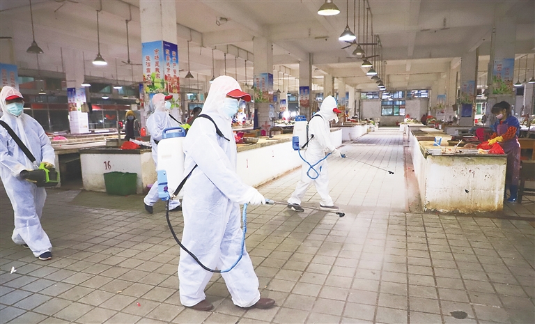 2月24日,在定安縣定城鎮(zhèn)農(nóng)貿(mào)市場(chǎng),專業(yè)人員在開展消殺工作。
